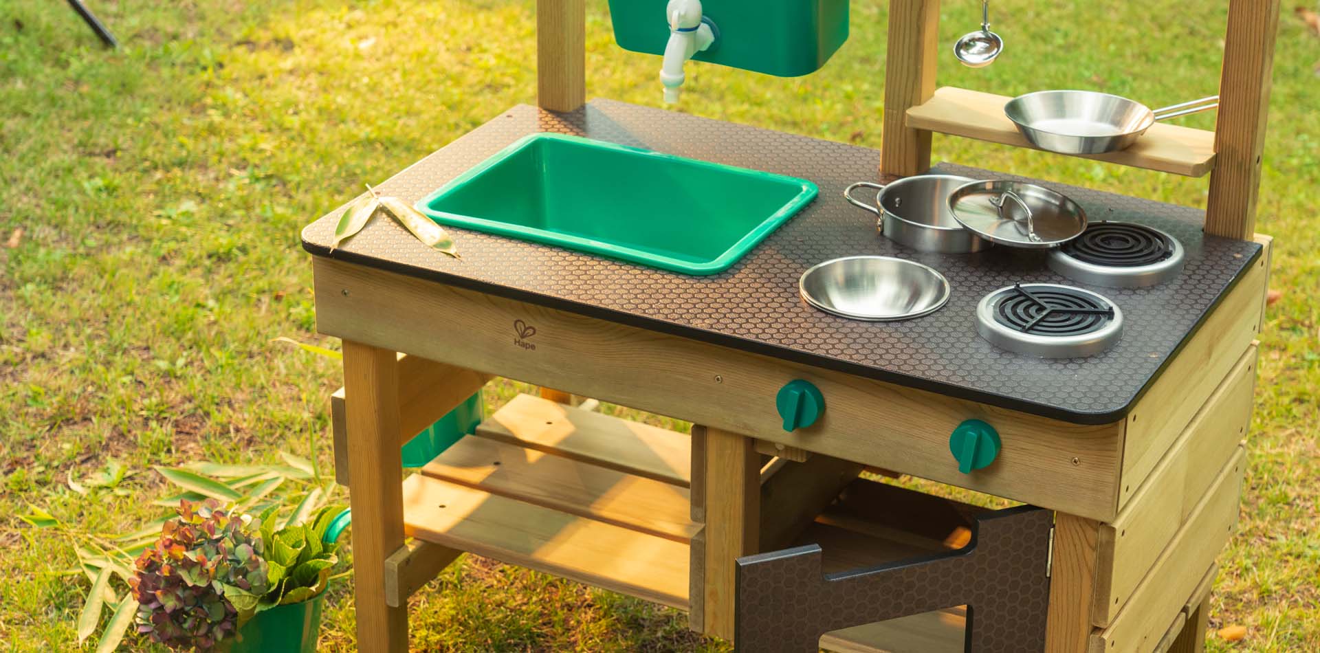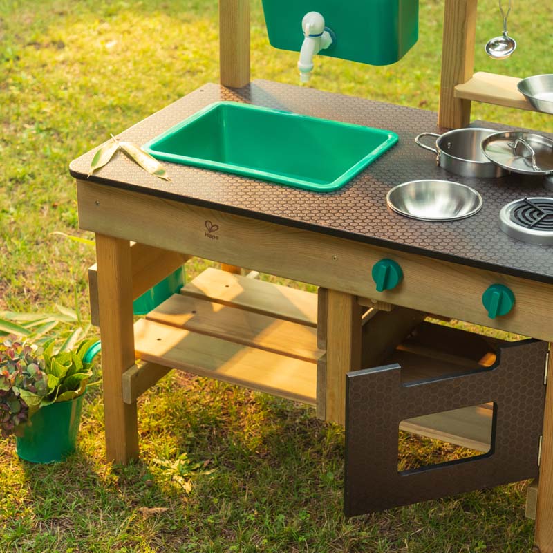 Disfruta de los días soleados con esta cocina al aire libre. Esta cocina incluye todo lo necesario para preparar deliciosa comida con barro como un tanque de agua, un grifo, un fregadero, fuegos y un horno. Además, puedes colgar las dos macetas con los ganchos y tener un pequeño jardín.