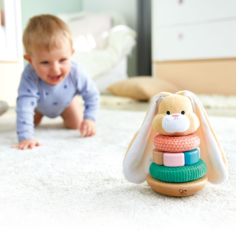 Este bonito Conejito Apilable pondrá una sonrisa en la cara de los más pequeños y pequeñas. El juguete consta de cinco partes: una base hecha de madera de haya, tres anillos apilables de diferentes materiales táctiles y una cabeza de conejo blandita con orejas largas. Uno de los anillos apilables tiene una bonita cola con un pompón que puede agarrarse y también hace suaves y alegres sonidos.