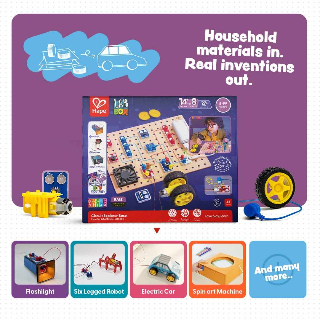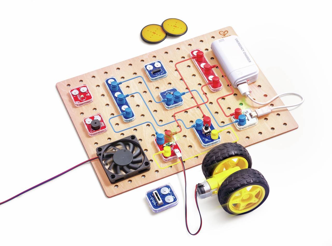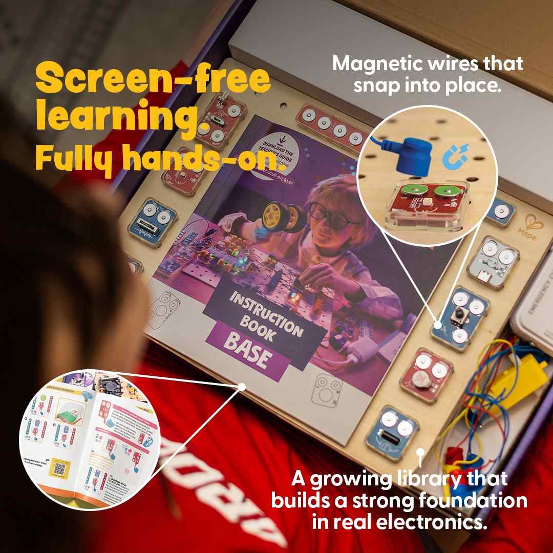 El Kit Base de Explorador de Circuitos es el kit de electrónica perfecto para principiantes, niños curiosos, jóvenes inventores y aspirantes a ingenieros. Con bloques inteligentes que se encajan magnéticamente, este kit hace que el aprendizaje de los circuitos sea divertido, seguro e interactivo. Sigue paso a paso los proyectos para construir una linterna, un coche eléctrico, una máquina de burbujas, ¡y mucho más!