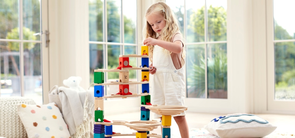 Comienza construyendo tus propias pistas de carreras con este set para principiantes Quadrilla. Coloca dos canicas en la parte superior y observa cómo bajan por distintas rutas hasta la meta del fondo.