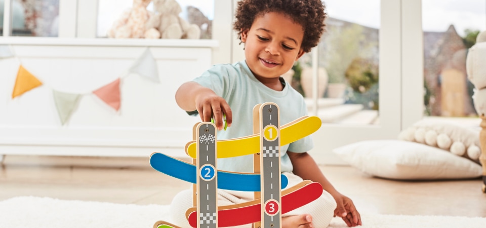 Comienza construyendo tus propias pistas de carreras con este set para principiantes Quadrilla. Coloca dos canicas en la parte superior y observa cómo bajan por distintas rutas hasta la meta del fondo.