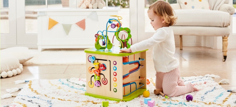 Con sus discos giratorios, botones, laberintos, lazos de motricidad y otros juegos, este centro de actividades de seis lados ofrece un mar de diversión. Un espejo refleja las sonrisas de los niños.